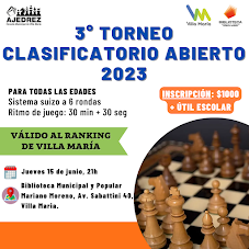 El jueves 15 de junio a partir de las 21 h, en la Biblioteca Municipal y Popular Mariano Moreno, Av. Sabattini 40, se dará comienzo el 3° Torneoe Clasificatorio de la Escuela Municipal de Ajedrez de Villa María 2023.